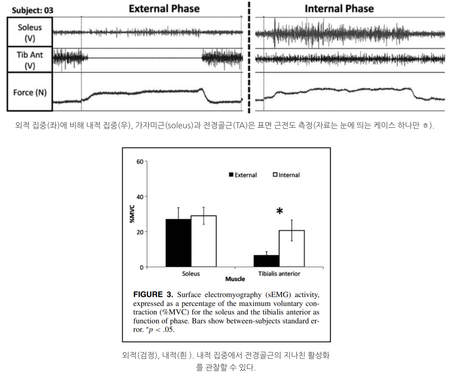 - 내적 초점 조건에서 더 높은 근활성도 관찰