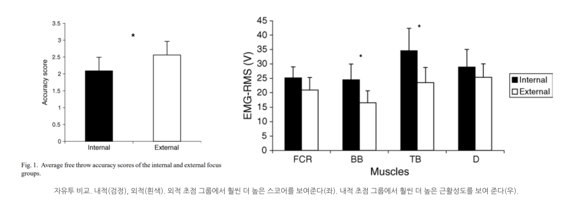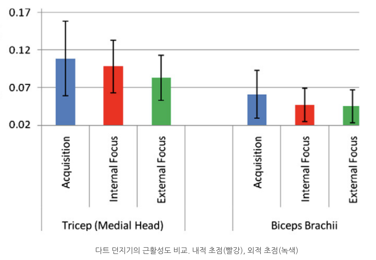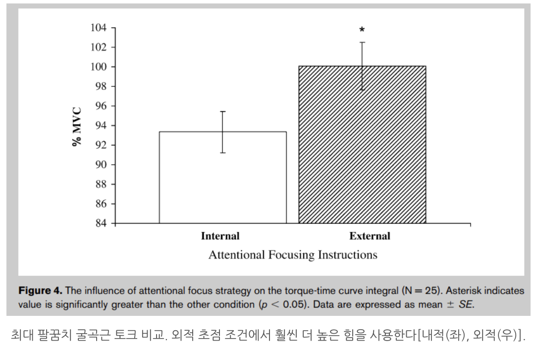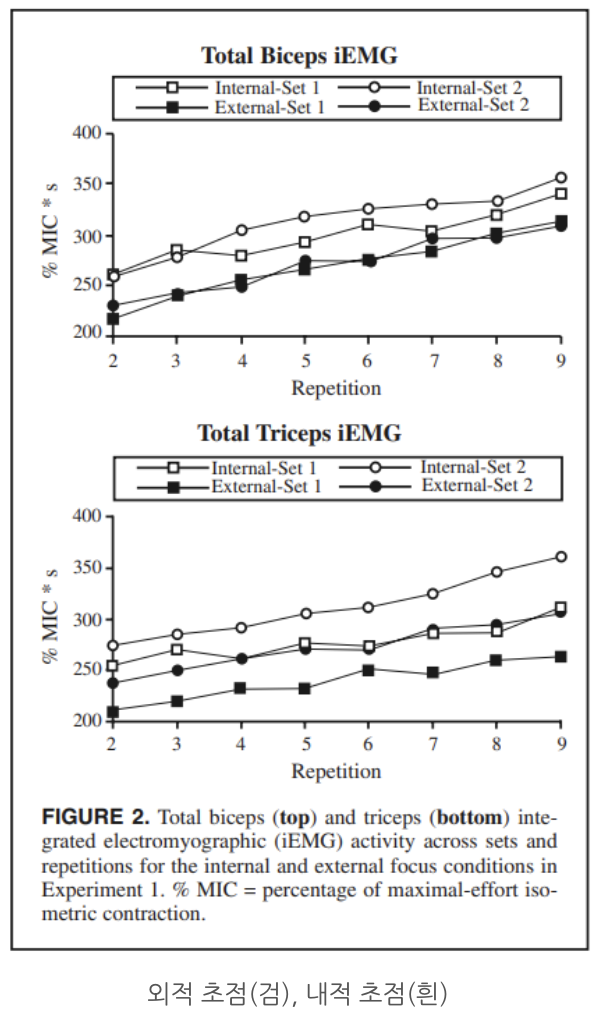 결과 : 내적 초점에 비해 외적 초점 조건에서 주동근(이두근), 길항근(삼두근) 모두 EMG 활동이 낮게 나타났다.