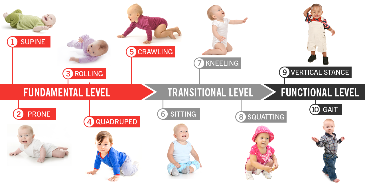 아기는 세상에 태어나서 가동성을 잃지 않고 이 프로그레션을 자연스럽게 따라갑니다. 운동과 재활에 대한 우리의 제안은 움직임 패턴이 기능부전 상태일때 이 표준을 재현하는 것 입니다. Functional Movement Systems는 기능 장애를 식별하고 건강하고 진정한 움직임을 위한 교정 전략을 수립하는 방법을 배우는 데 도움이 됩니다.