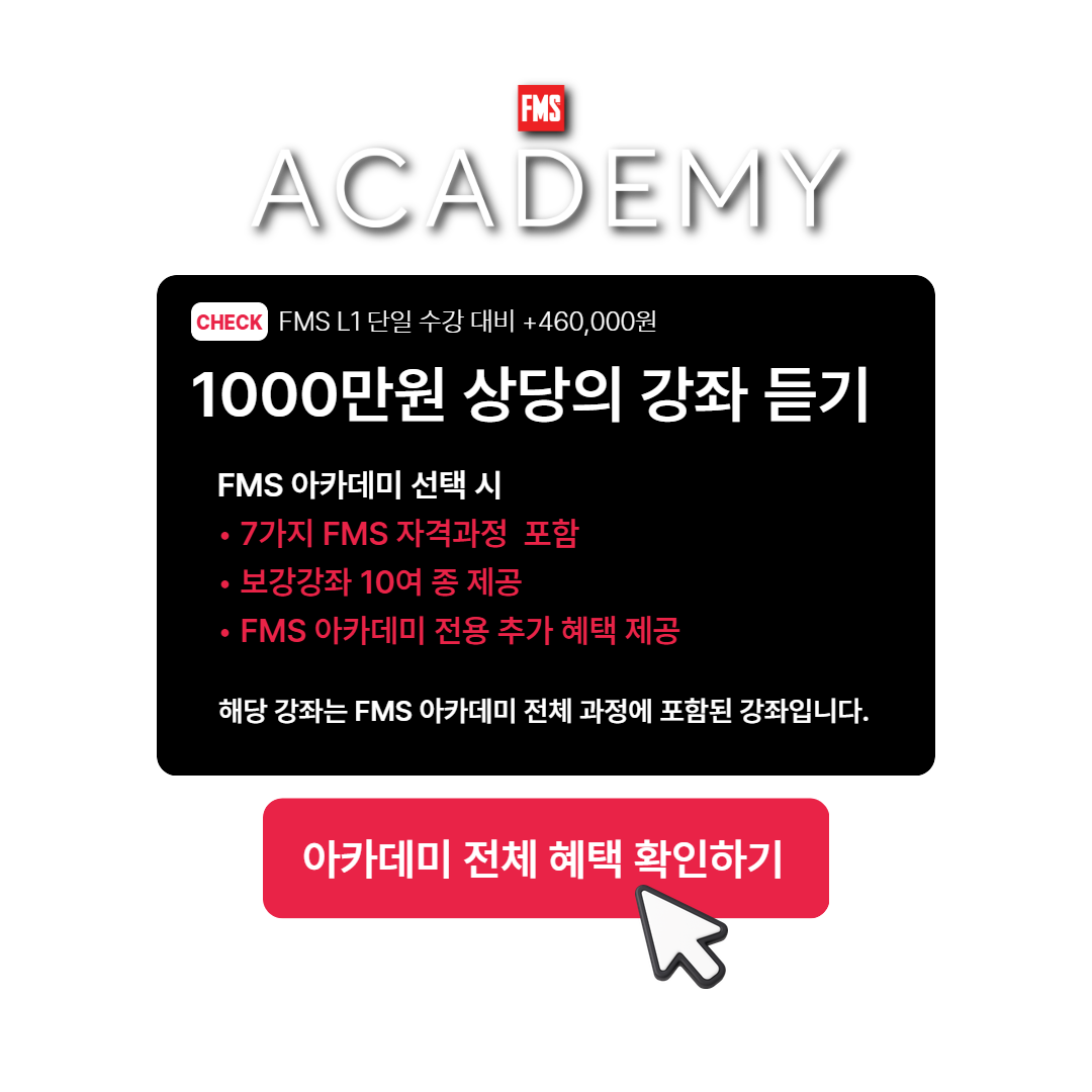 본 강좌는 저작권자인 FMS사의 자체 규정에 따라 결제후 환불이 불가능한 국제자격인증과정입니다. FMS사에서는 본 과정의 결제비용을 등록비용으로 보고 있기 때문에 환불을 허용하지 않고 있습니다. 자세한 사항은 FMS사 본사 홈페이지를 참조하세요.