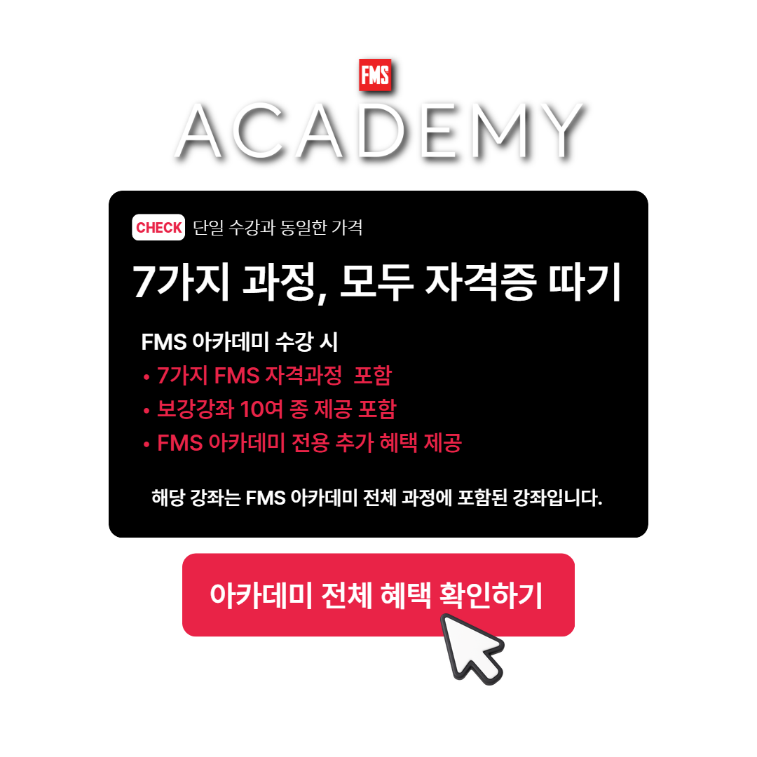 본 강좌는 저작권자인 FMS사의 자체 규정에 따라 결제후 환불이 불가능한 국제자격인증과정입니다. FMS사에서는 본 과정의 결제비용을 등록비용으로 보고 있기 때문에 환불을 허용하지 않고 있습니다. 자세한 사항은 FMS사 본사 홈페이지를 참조하세요.