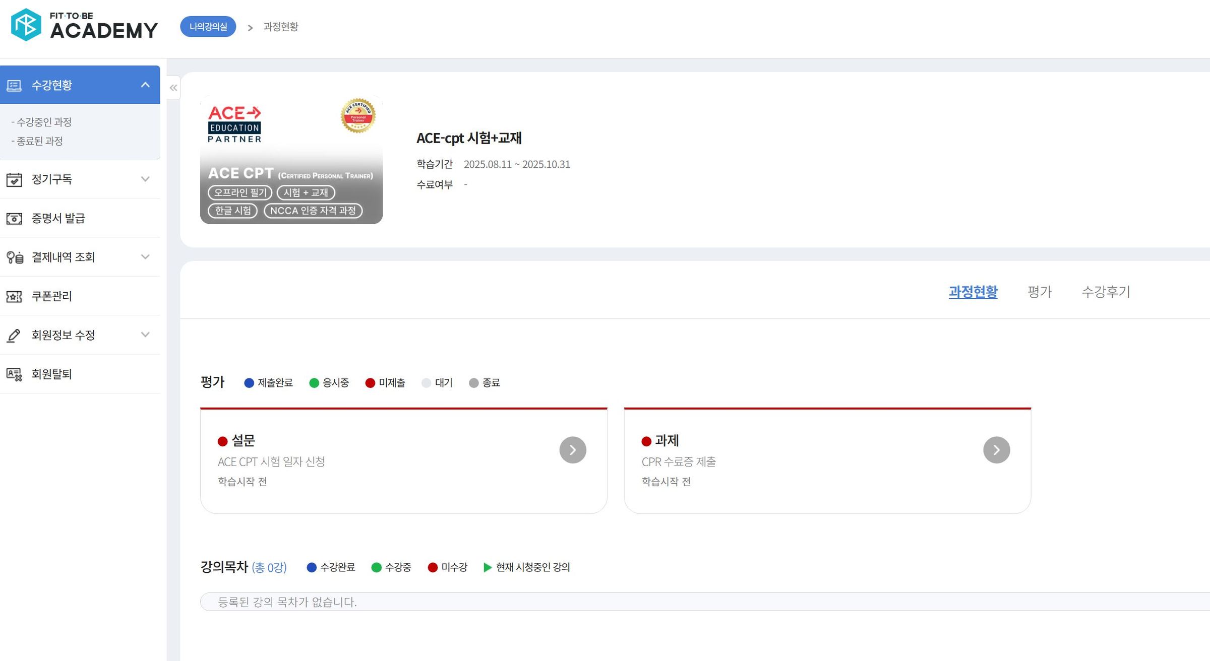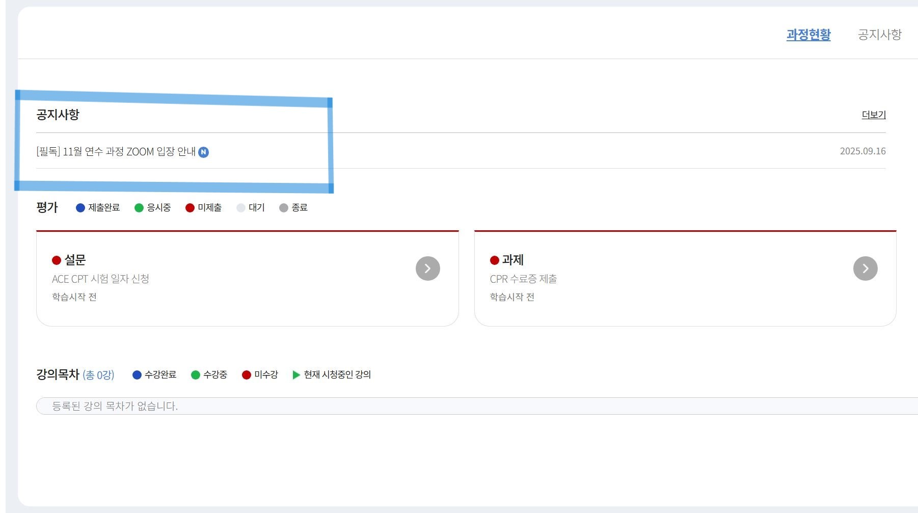 ※ ACE CPT 시험 응시 전, 반드시 응시일 기준 유효한 CPR 수료증을 과제 제출란에 제출해주셔야합니다.